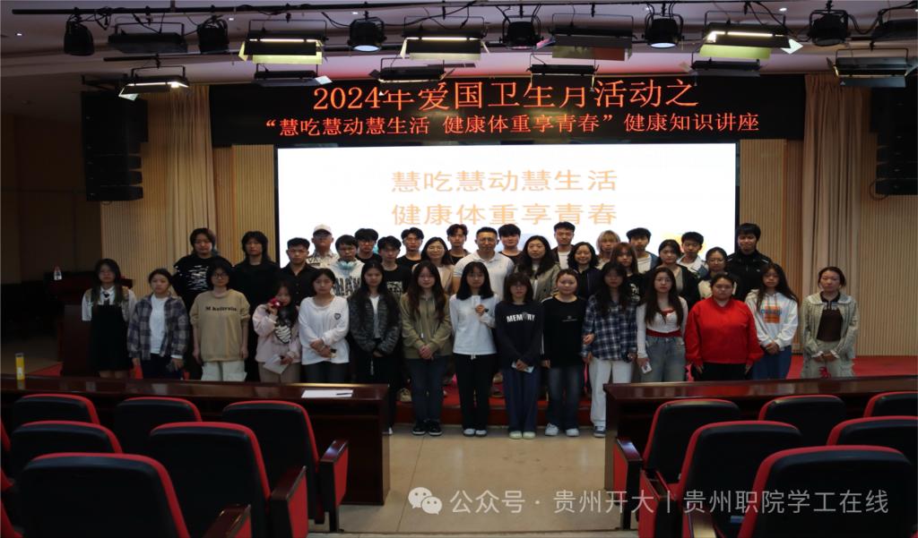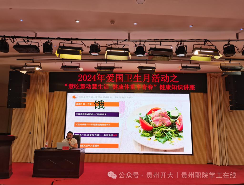 2024年4月,是我国第36个爱国卫生月。为深入贯彻落实习近平总书记关于爱国卫生运动的重要指示精神,推动健康中国建设,弘扬爱国卫生运动新风尚,增强学生体重管理意识和自我保健能力,4月19日上午,党委学工部特邀贵州省人民医院营养部中级营养师彭子豪到校开展健康知识科普讲座。学校教职工代表和各学院学生代表参加。