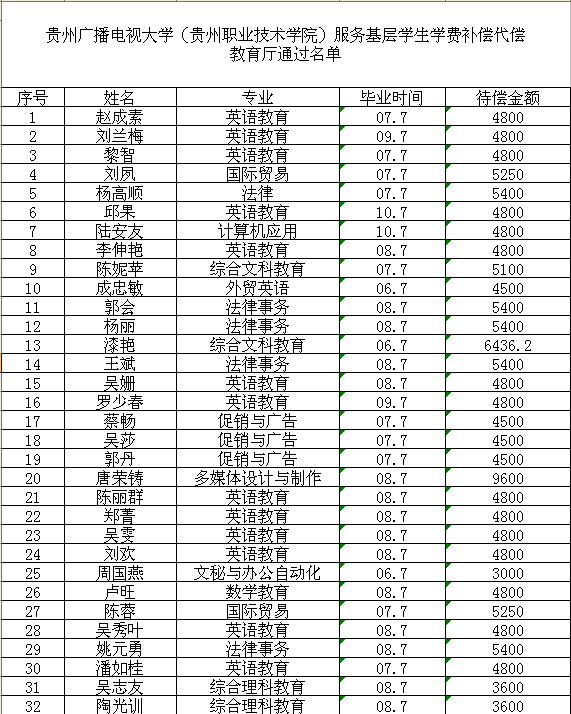 6月30日自教育厅资助办领取我校基层服务学生学费补偿代偿审查结果后,将预审通过名单挂网告知,请有疑问的学生电话咨询学生处:0851-4129679。