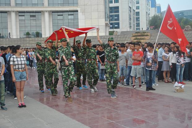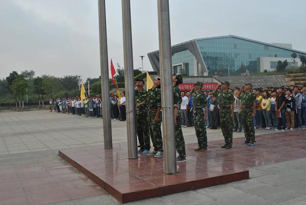 本次军训中优秀学员组成的国旗班迈着整齐有力的步伐迎出国旗,全体2013级新同学向国旗行注目礼。在庄严的国歌声中,五星红旗在职院的上空缓缓升起,鲜艳的旗帜迎风招展,职院学子激情满怀。随后,学生处吴异老师利用难得的集中时间再次就学生在校期间“一日行为规范”提出具体要求,全体新同学认真聆听。