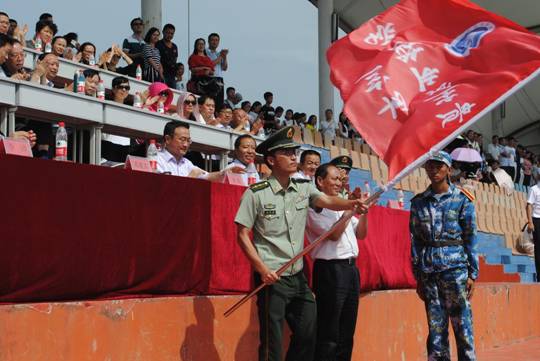 会上,学校党委书记邓惠宾向军训团授旗,迎风飘扬的旗帜,代表着本次军训正式开始。