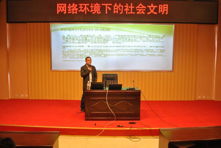 龚左林老师主要围绕大学生诚信档案,诚信还贷,微博、微信与网络诚信和近期网络热点问题等四个方面分析阐述了网络环境下的社会文明。结合典型案例,由浅入深,分析了同学们的注意事项并提出四条“黄金”建议:1、了要善于网上学习,不浏览不良信息;2、要诚实友好交流,不辱骂欺诈他人;3、要增强自护意识,不随意约会网友;要维护网络安全,不破坏网络秩序;4、要有益身心健康,不沉溺虚拟时空。