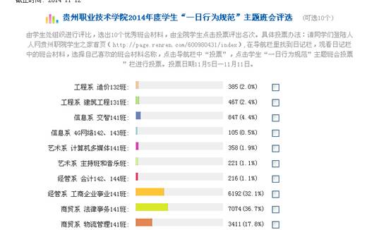 经过筛选,共有10个班级主题班会在人人网贵州职院学生之家发起公众投票,最高点击率达19276票。