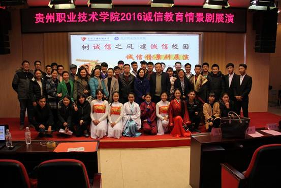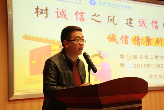 根据省教育厅相关要求,为进一步做好我校学生诚信教育工作,积极构建“以诚信为荣”的校园文化氛围,提高资助育人实效,学生资助管理中心在全校范围内开展了以“树诚信之风,建诚信校园”为主题的诚信教育系列活动。11月24日晚19点,贵州职业技术学院2016诚信教育情景剧展演在我校图书馆二楼学术报告厅成功举行,学生资助管理中心主任陈鹰、各学院团总支、辅导员代表及200余名学生参加。活动由学生资助管理中心副主任刘婕主持。