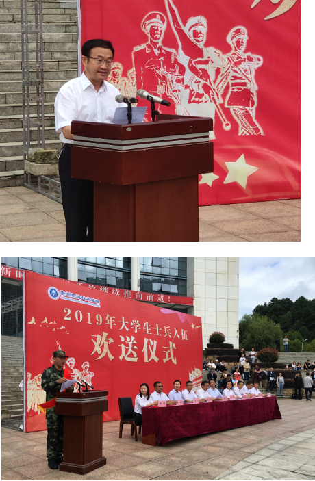 李皖校长首先对光荣加入中国人民解放军的2019级大学生士兵表示祝贺,向为顺利完成征兵任务付出辛苦和努力的各二级学院和观山湖区武装部表示感谢。并对入伍新兵提出殷切希望,一要树立从军报国的理想,二要发扬不怕苦、不怕累的精神,三要苦练军事本领,立志成才,做到政治合格、军事过硬、作风优良、纪律严明、精忠报国、为校争光,做一名永远忠于党和人民的好战士。
