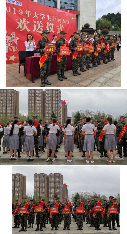 2019年9月11日上午,贵州职业技术学院2019年大学生士兵入伍欢送仪式在学校校前广场隆重举行。学校党委副书记、校长李皖、副校长徐伟,各学院、团委、武装部等相关部门人员、2019年入伍大学生士兵、新兵家属及学生代表参加欢送仪式。