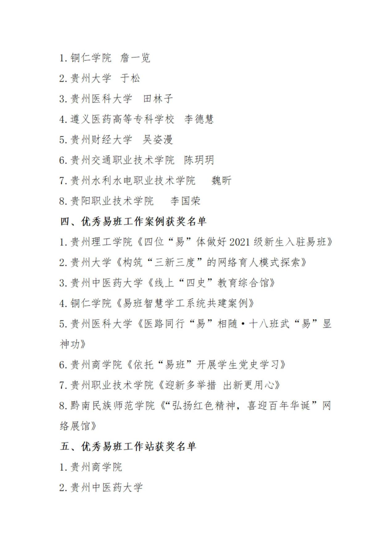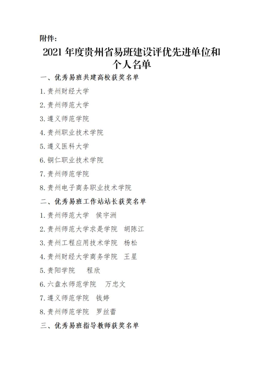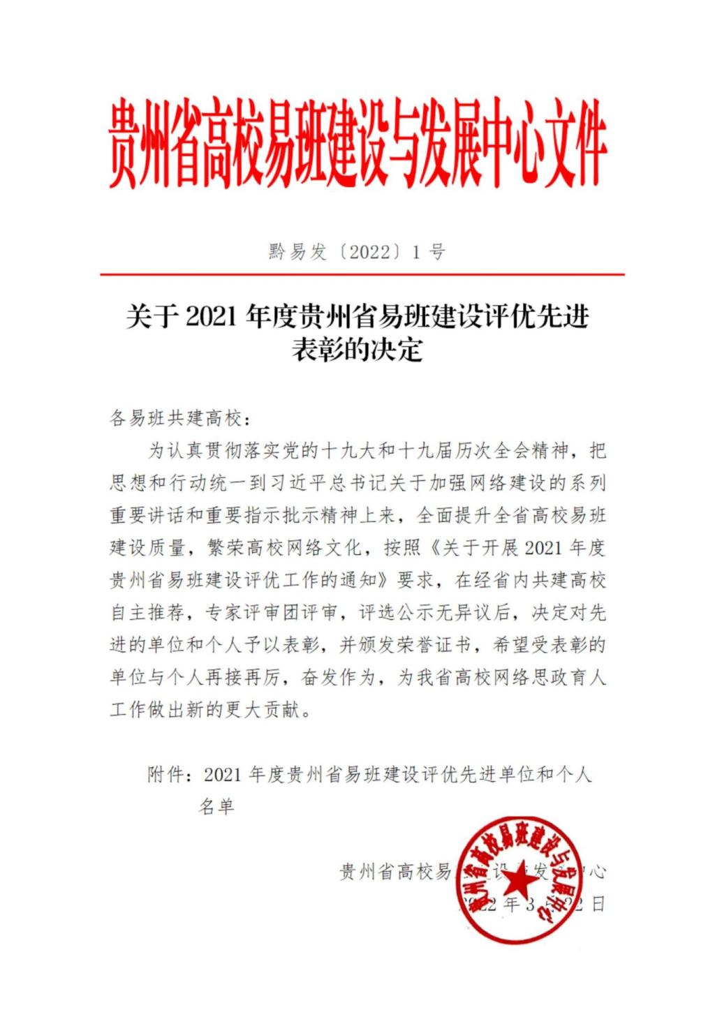 为认真贯彻落实党的十九大和十九届历次全会精神,把 思想和行动统一到习近平总书记关于加强网络建设的系列 重要讲话和重要指示批示精神上来,全面提升全省高校易班 建设质量,繁荣高校网络文化,按照《关于开展2021年度贵州省易班建设评优工作的通知》要求,经自主推荐,专家评审团评审,评选公示无异议后,贵州省易班发展与建设中心决定对推选出的先进单位和个人予以表彰,我校被评为2021年全省优秀易班共建高校,迎新工作案例获全省优秀易班工作案例。