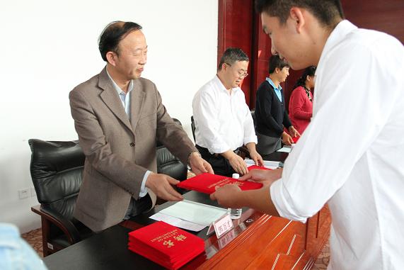 于立群处长宣读完《关于2014级新生学长聘任决定》后,在欢快的颁奖音乐中,聘任仪式隆重举行,学长轮流上台领取鲜红的聘书。随后,学长和2014级新生辅导员代表分别发言,郭万才书记作重要讲话。