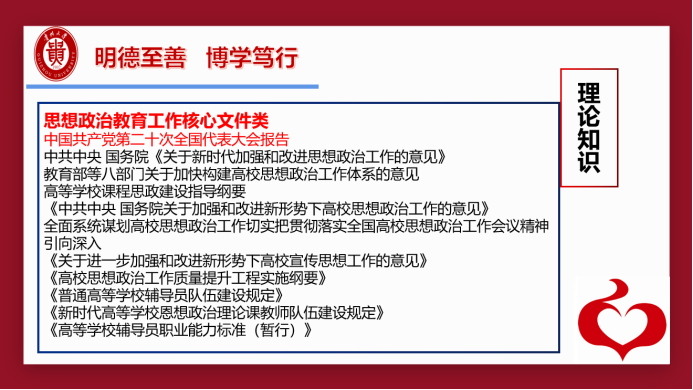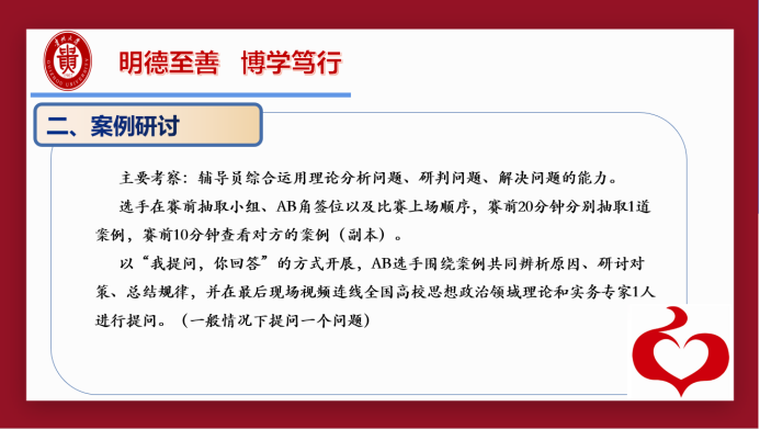 李云副教授从贵州省各高校辅导员历届参赛历程和辅导员素质能力大赛的变革为出发点,对辅导员素质能力大赛做了详细的解读,大赛主要分为基础知识测试、案例分析、谈心谈话三部分组成。李云副教授通过自身参赛经历,重点讲解了笔试的备赛要点、案例研讨环节的变化和应对策略,谈心谈话环节的关键及技巧,强调新时期辅导员应具备的技能,动员辅导员老师们积极参加此类比赛。同时,李云副教授也将思想政治教育工作核心类文件及重要会议精神融入真实案例研讨,让辅导员对于大赛的形式和标准把握更加精准,能够更好地备赛。