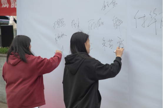 第二个环节是“爱的宣誓”。老师和同学们任意选择一条心理咨询中心为大家准备的“爱心誓言”进行宣誓,宣誓完毕郑重地在签名墙上留下签名。通过积极心理暗示促进师生悦纳自我,在爱的仪式感中强化师生爱的力量。