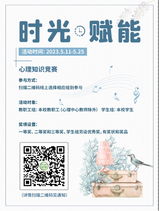 为了进一步增强我校心理健康建设,丰富校园文化生活,宣传心理健康知识,提高师生的心理健康意识,营造健康、和谐的校园氛围,2023年5月11日-30日,我校学工部心理健康教育与咨询中心面向全体师生在线上开展第三届“时光·赋能”清宁文化节心理知识竞赛。