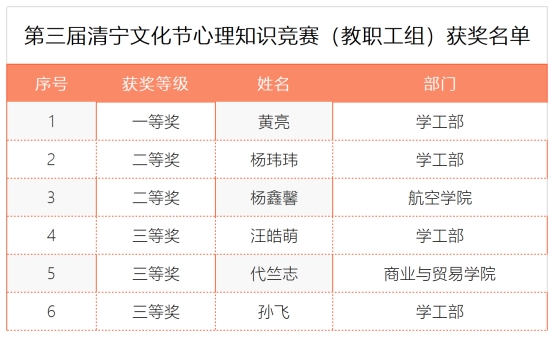 本次活动分为教职工组和学生组,通过单选题、多选题和判断题考察师生们对心理咨询、睡眠、认知、情绪和人际关系等多方面知识的了解程度。答题时间限时20分钟,每人限答一次,答题总分高且用时短者为优胜者。最终教职工组产生了一等奖1名、二等奖2名、三等奖3名;学生组产生了一等奖1名、二等奖2名、三等奖3名,以及优秀奖10名。