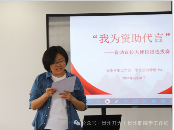 活动最后,评委们根据参选选手们宣讲内容的准确性、语言组织表达能力以及形象气质、准备充分程度等情况,评选出毛广爽等8名同学为2024年贵州开放大学(贵州职业技术学院)资助宣传大使。