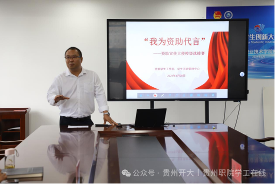 为进一步加大学生资助政策宣传力度,发挥获奖受助学生典型示范和引领作用,推进国家资助政策宣传的广度和深度,传播资助育人好声音。6月28日中午,贵州开放大学(贵州职业技术学院)“我为资助代言”——资助宣传大使评选活动校级选拔赛在科研楼319会议室举行。党委学工部、学生资助管理中心相关老师参加活动。
