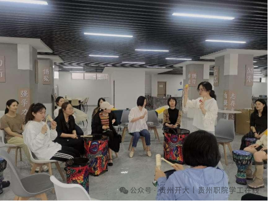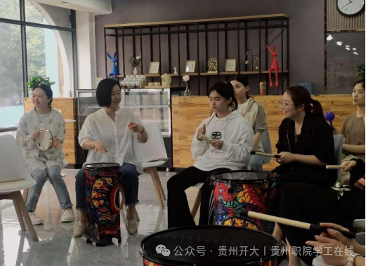 在解压活动—鼓圈音乐疗愈环节,辅导员老师们在杨欢老师的带领下,敲击着不同的鼓圈乐器,转入一段轻松愉悦的旅程。在不同的鼓点节奏中,大家感受到感受鼓圈音乐的魔力。仿佛在此时此刻,无论生活还是工作,都以鼓声为媒,融进窗外的雨声,无惧风雨踔厉前行,共赴一场关于成长与认同的盛宴。